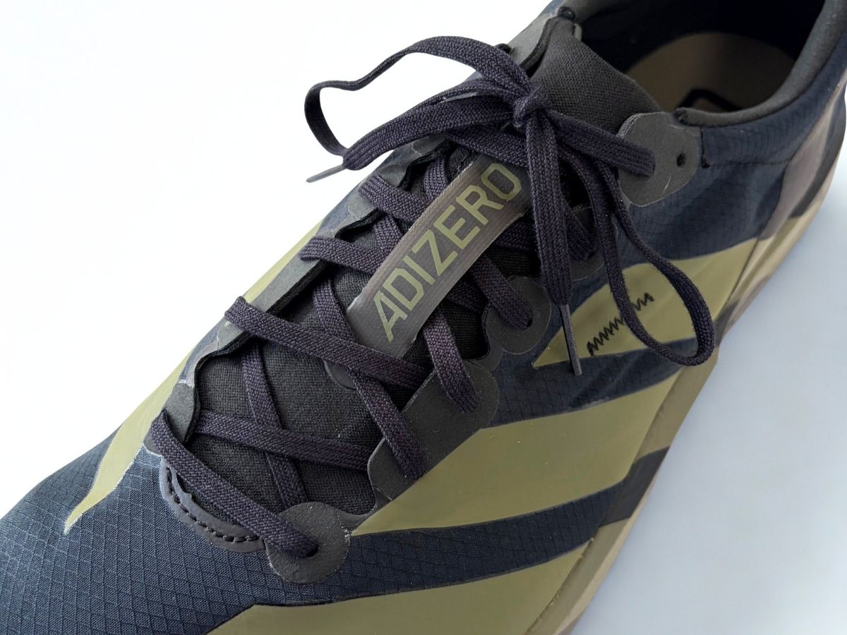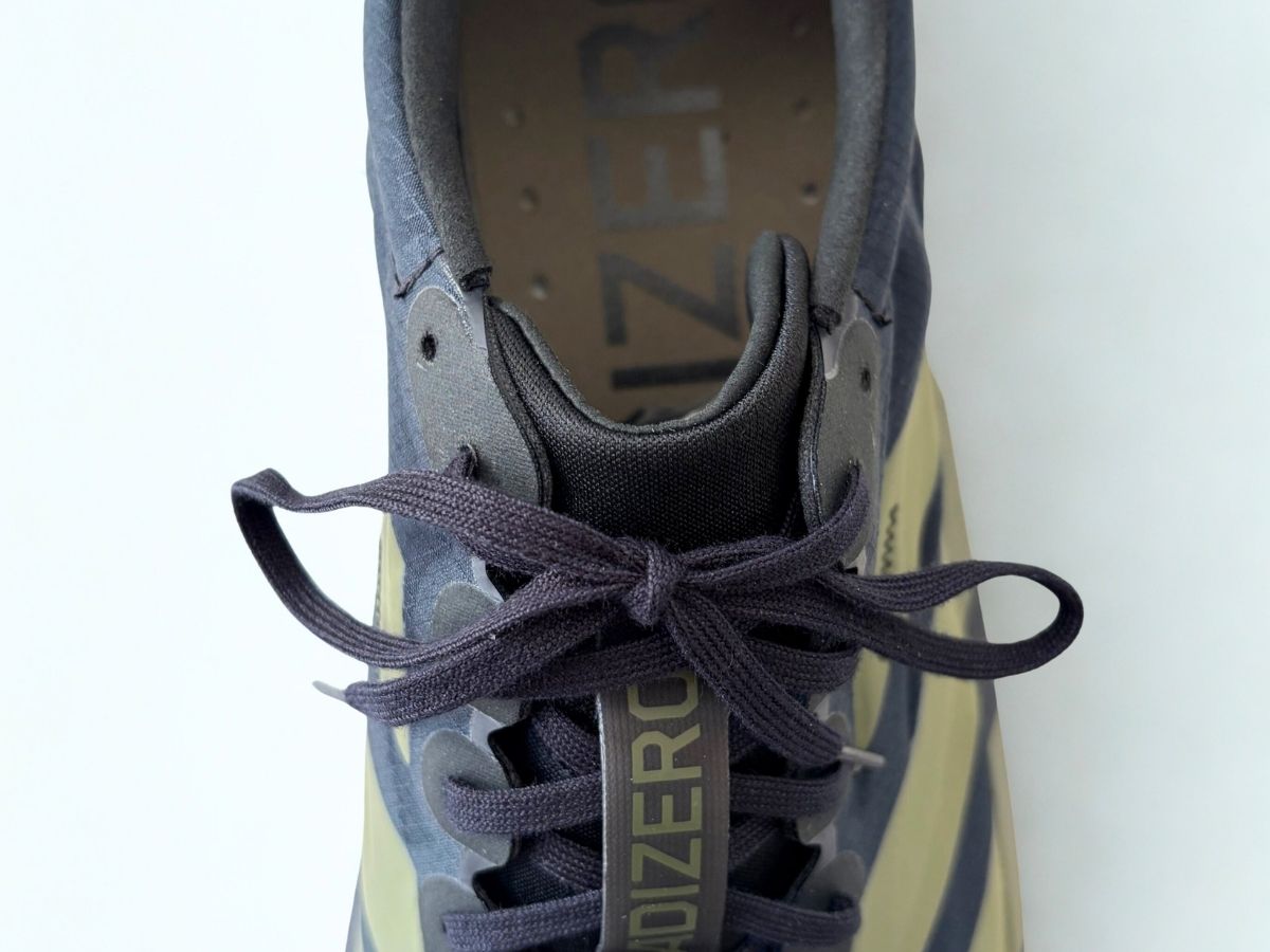 他のアディゼロシリーズ同様、細めで伸縮性のないシューレースが採用されています。長さは必要最低限で、ランナーズノット(2段ハトメ)結びをするには少し短いかもしれません。