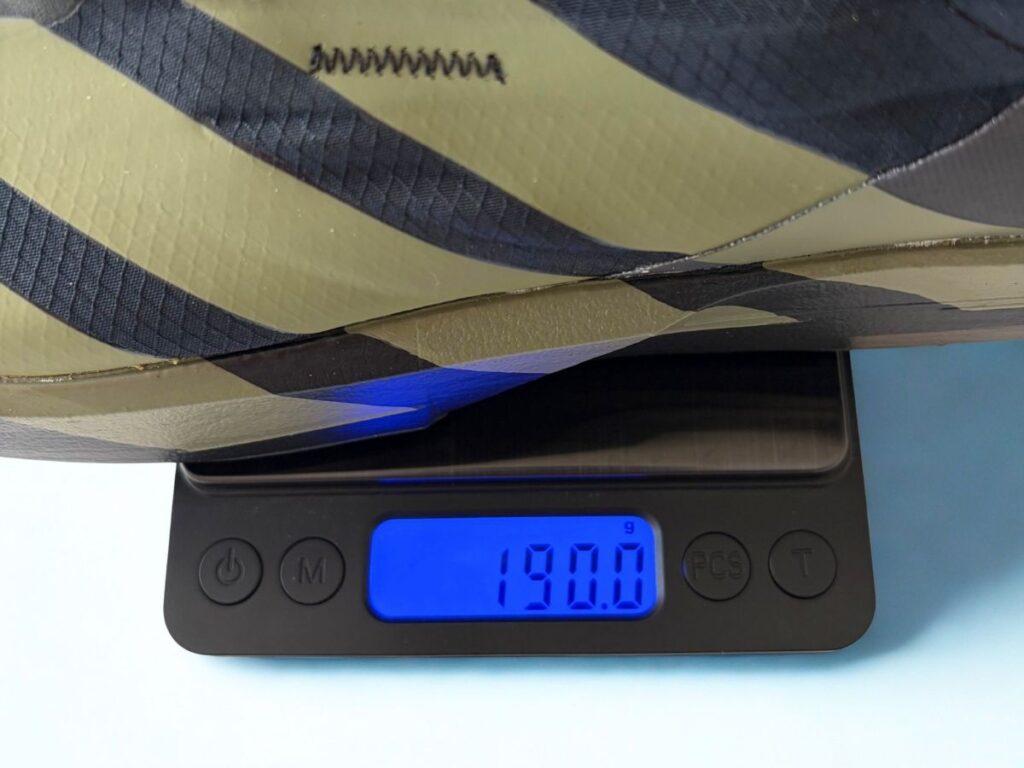 アディゼロ ジャパン 9(ADIZERO JAPAN 9)の重量(編集部実測値)は、メンズ28.0cm(US 10)で約190gです。200gを大きく切る、超軽量なシューズです。