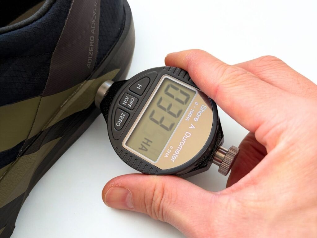 ミッドソールの特性を客観的にデータ化するため、硬度計(デュロメーター)を使用してフォームの硬さを測定しました。