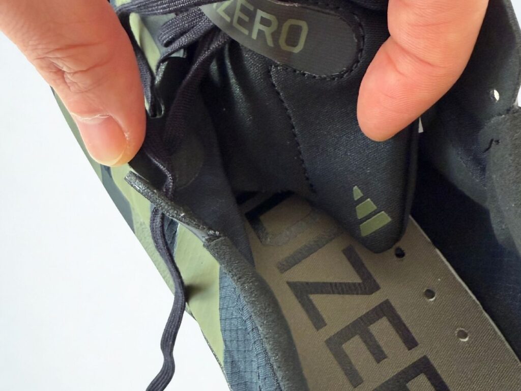 プラスチックの硬い補強材は入っていませんが、履き口のクッション材は必要最低限入っており、ランニング中に足が痛くなることはありませんでした。