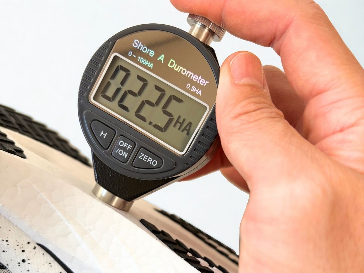ミッドソールの特性を客観的にデータ化するため、硬度計(デュロメーター)を使用してフォームの硬さを測定しました。