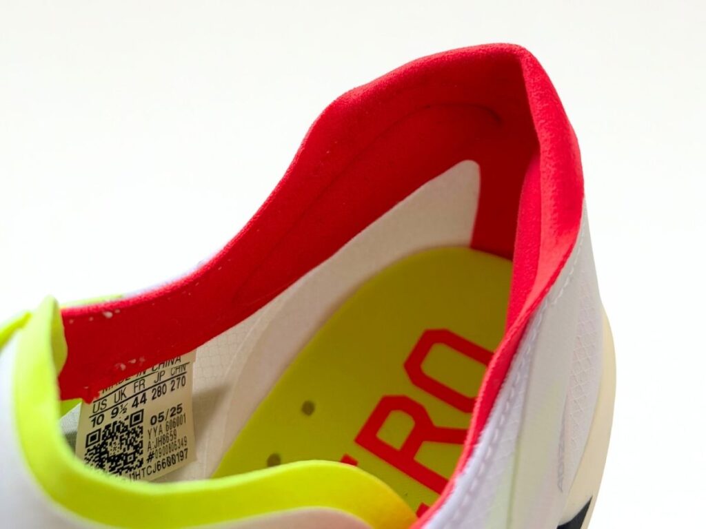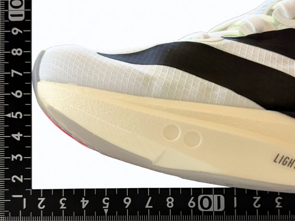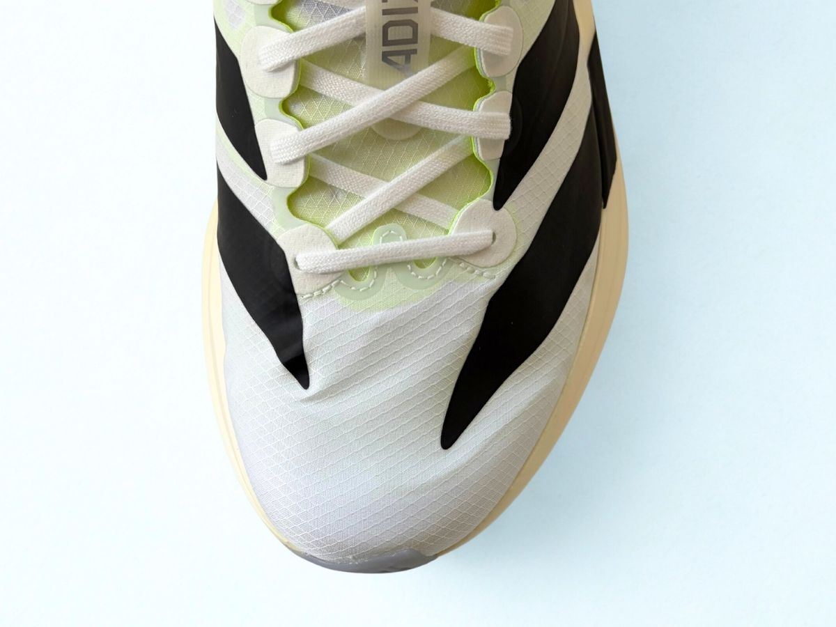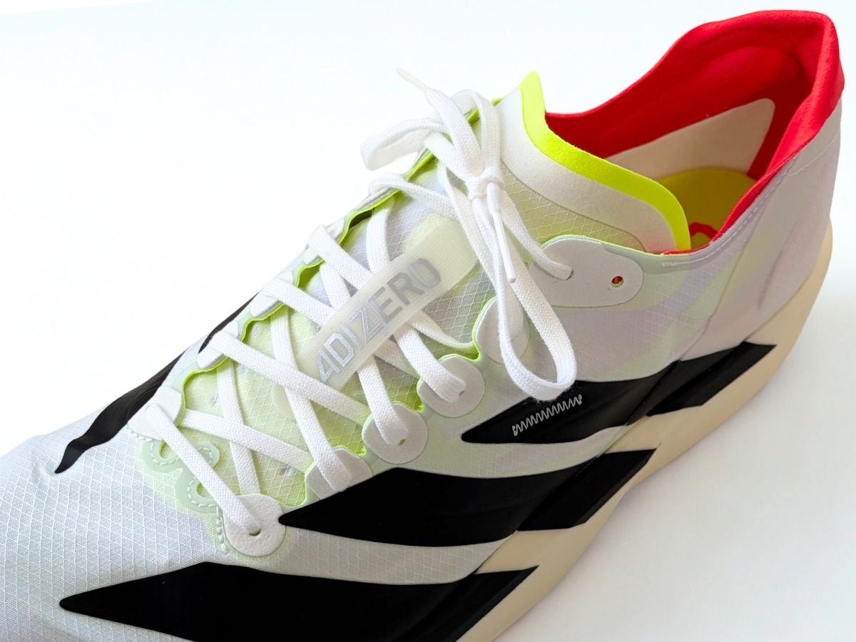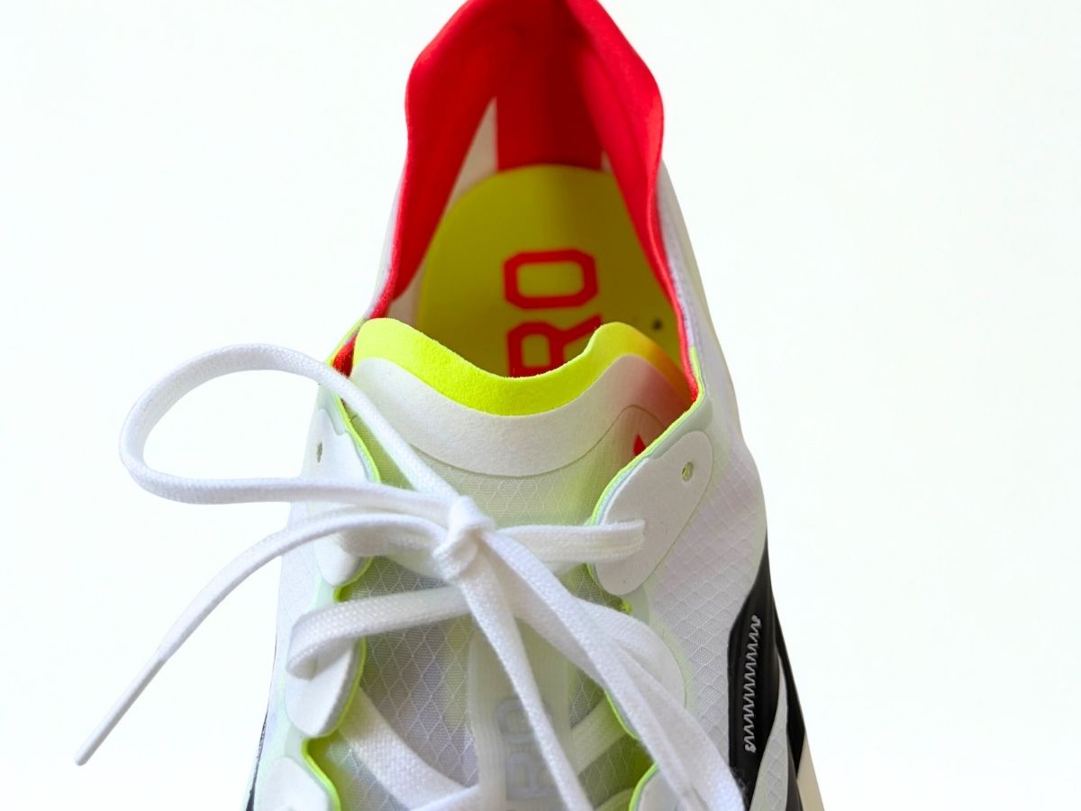 これまでのアディゼロシリーズ同様、細めで伸縮性のないシューレースが採用されています。一番上の穴まで通すランナーズノット(2段ハトメ)結びをするには、長さが少し短く感じます。