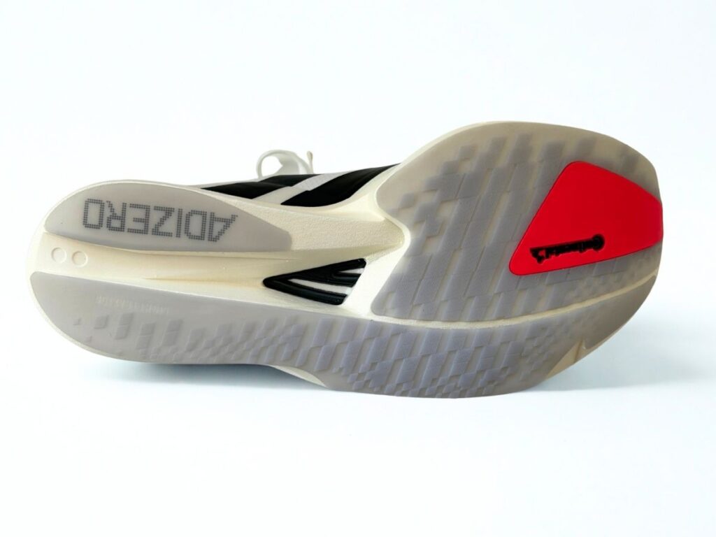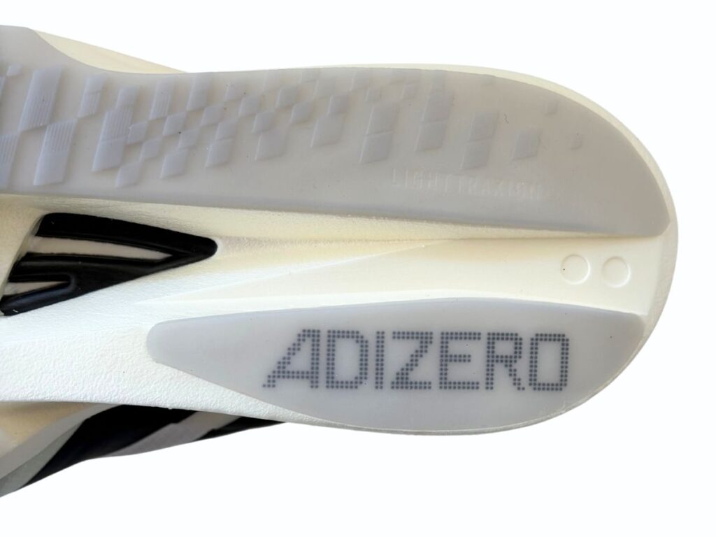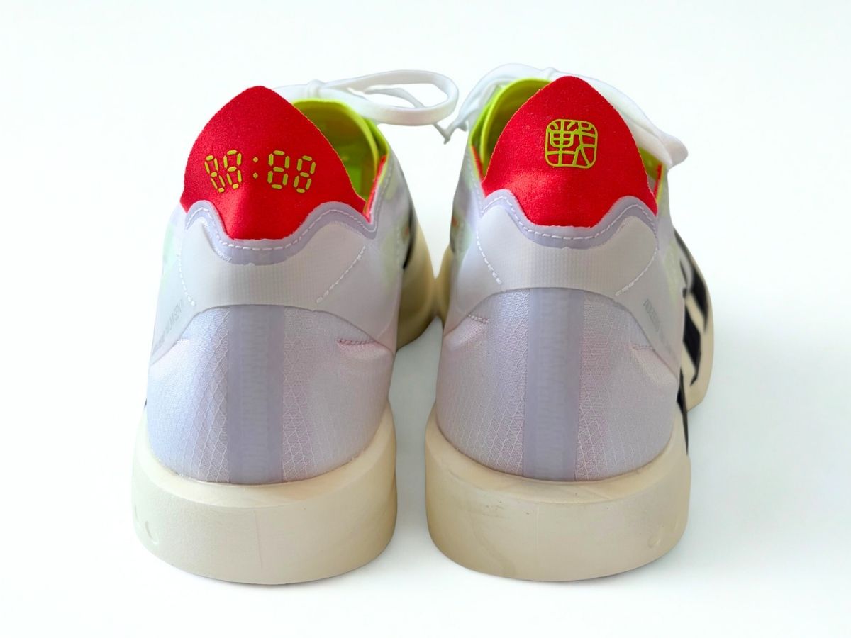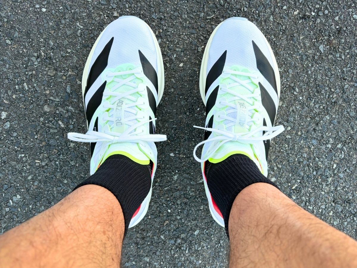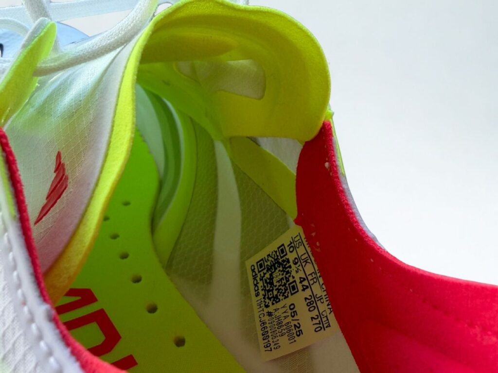 これまでのアディゼロシリーズ同様、細めで伸縮性のないシューレースが採用されています。一番上の穴まで通すランナーズノット(2段ハトメ)結びをするには、長さが少し短く感じます。