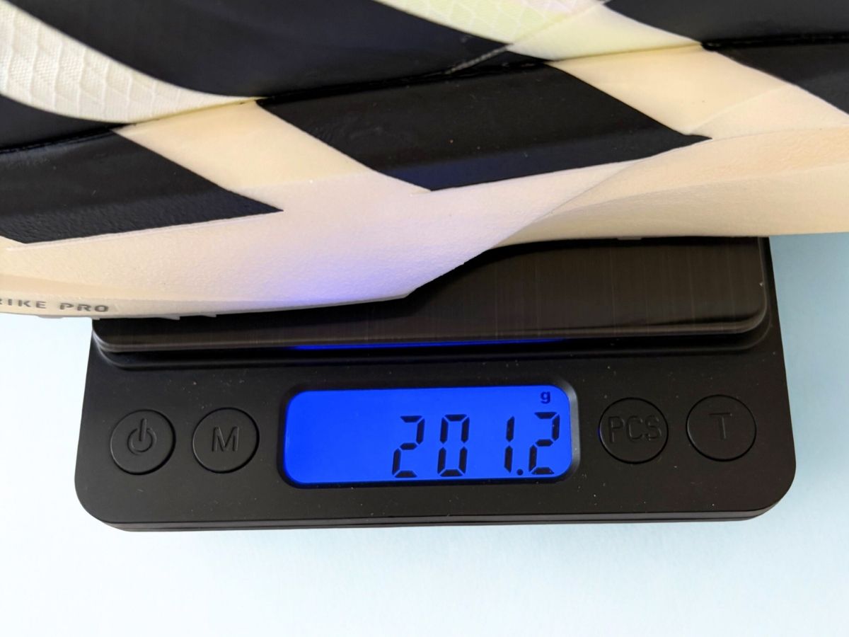 アディゼロ タクミセン 11の重量(編集部実測値)は、メンズ28.0cm(US 10)で約201gです。200gを大きく切るようなハイエンドの超軽量レーシングシューズと比較すると際立った数字ではありませんが、十分に軽量なシューズであることは間違いありません。