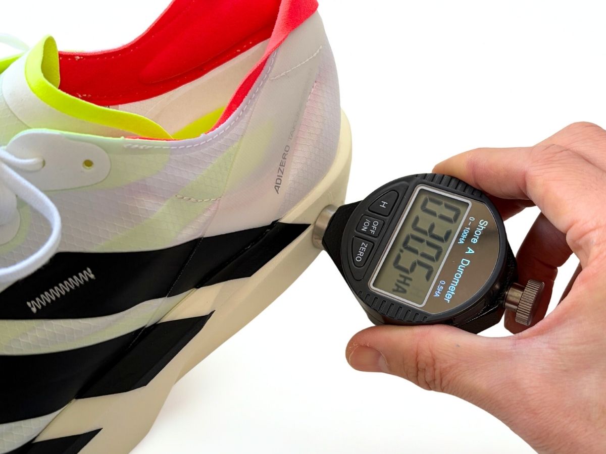 ミッドソールの特性を客観的にデータ化するため、硬度計(デュロメーター)を使用してフォームの硬さを測定しました。